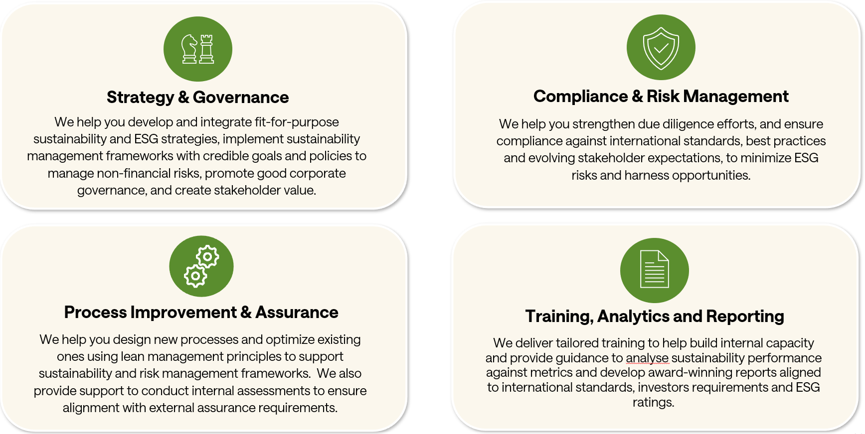 We are system thinkers who bring extensive global experience in sustainability, risk management and data science to deliver future-forward, fit-for-purpose solutions. We apply a value chain approach to help organizations manage impact beyond own operations, align with stakeholder expectations and create shared value.Deeply committed to giving back to our home country, Sri Lanka, we support sustainability education through teaching and research, aiming to drive long-term, local impact.
